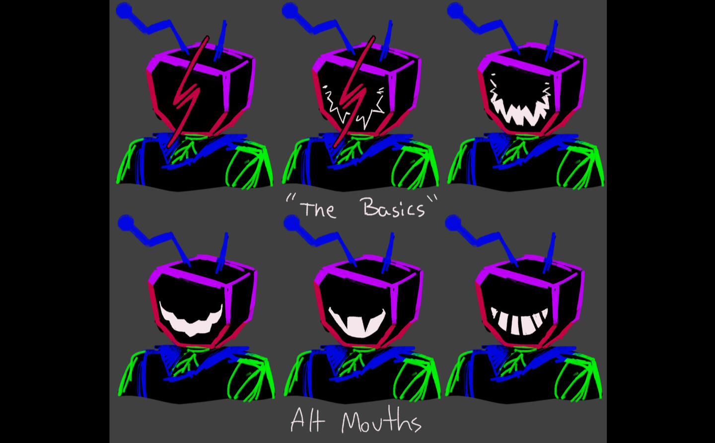 In the reference sheet above, his mouth is stylized to look like Tenna's regular sharp-tooth smile because he is in the process of assimilating Tenna -> starting to resemble his old self again.